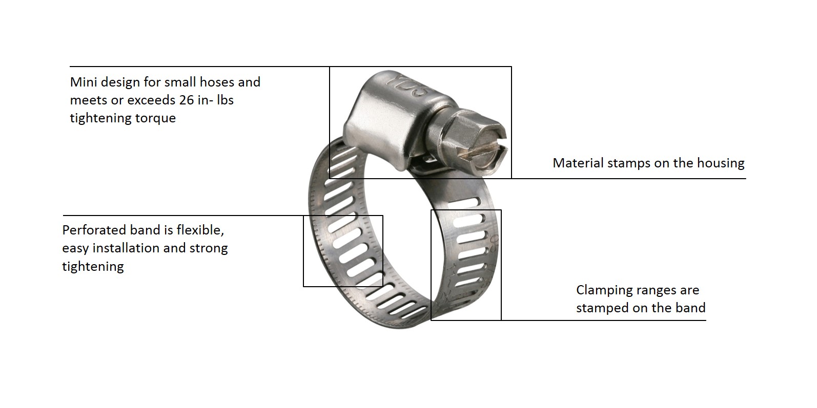The 0.35" band width is our innovated design for higher installation torque of meeting or exceeding 26 lbf-in (3.0 Nm). Material is stamped on the housing and clamping range is stamped on the band. Mini hose clamps are available in carbon steel screw, 430 S.S. screw, all 300 S.S. and all 316 S.S. material.