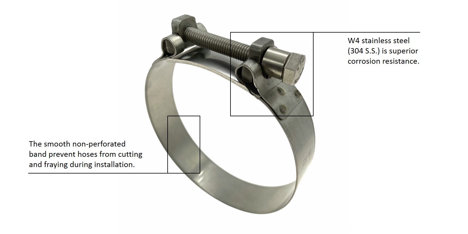 EVEREON TT high-pressure heavy duty clamps provide reliable pipe connections. Designed for using in applications of industrial machinery, automotive, trucks, agriculture, and heavy duty equipment. The smooth non-perforated band prevent hoses from cutting and fraying during installation. And the no steps or gaps inside band provides a safe seal. TT high-pressure heavy duty clamps are made of 304 stainless steel which are superior corrosion resistance.