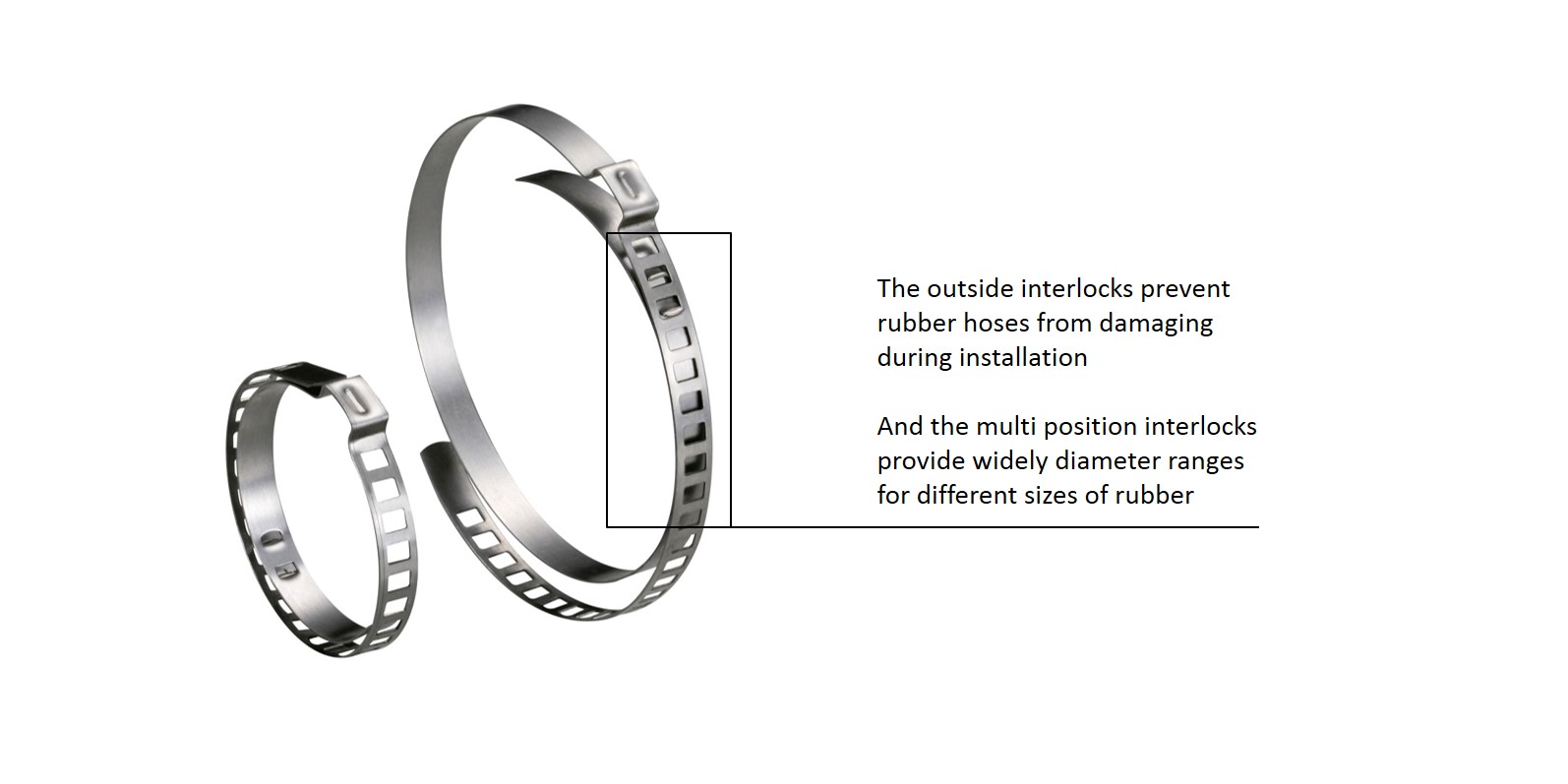 EVEREON CV boot clamp is specific used in CV (Constant-Velocity) joint boot of universal automobiles. The outward hooks prevent rubber hoses from damaging during installation. And the multi position interlocks provide widely diameter ranges for different sizes of rubber. Clamps are made of AISI 430 stainless steel material offering a economy clamp.
